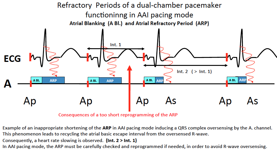 The programming of an excessively short refractory period facilitates oversensing, which is reflected by a resetting of the escape interval and a slowing of the pacing rate. The programming of an excessively long refractory period incurs a risk of non-sensing of ventricular premature events. In that case, a stimulus might be delivered at the end of the pacing interval on the T wave of the extrasystole. In AAI pacemakers, the first part of the refractory period is a programmable blanking period. The refractory period prevents the resetting by an R wave sensed in the atrium (ventriculoatrial cross talk). Its duration must be as long as the AR interval (between the atrial stimulus and the R wave), which is longer than the PR interval, though not inordinately long to ensure atrial sensing up to the maximum sensor-driven rate.